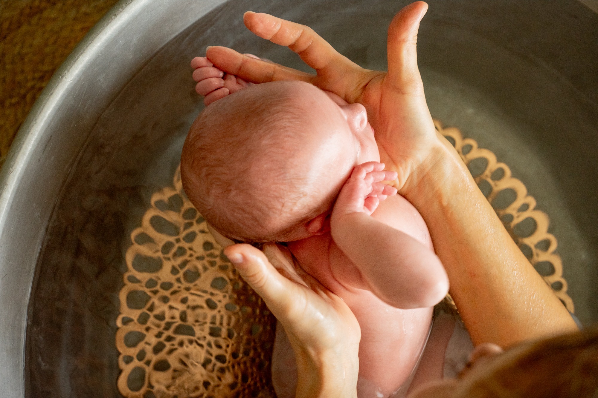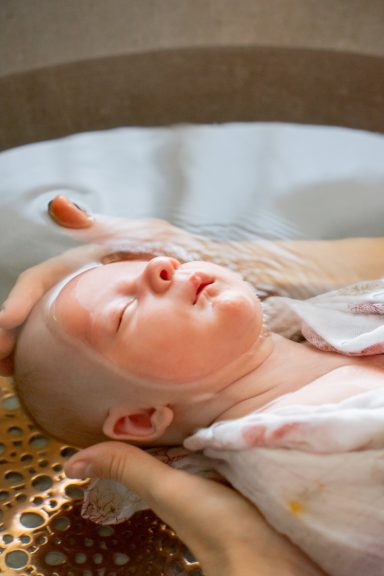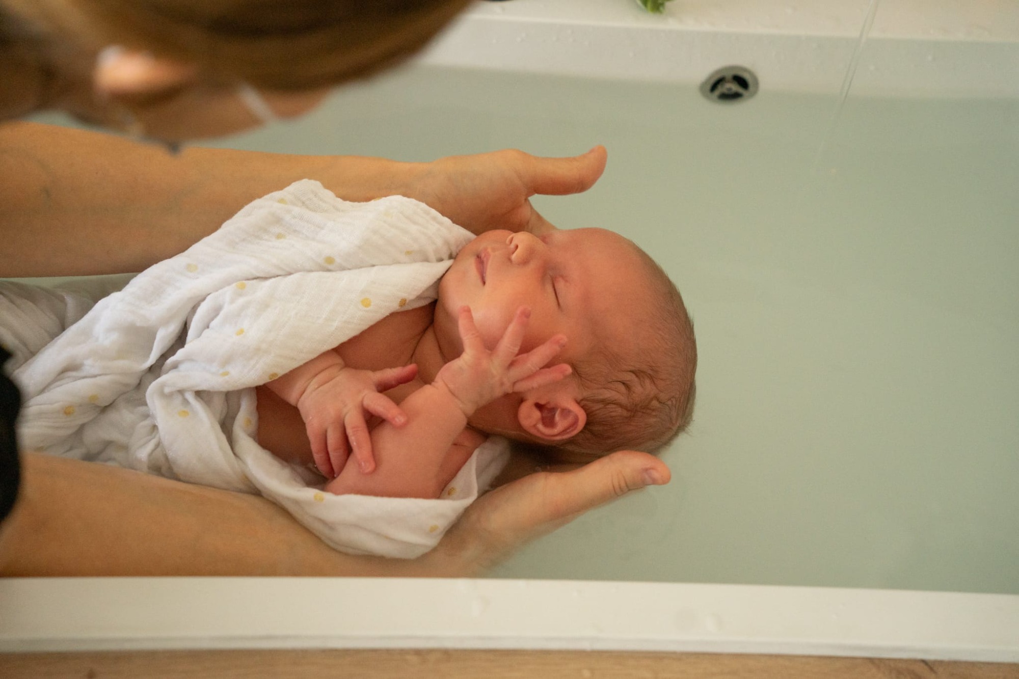 Je vous accompagne ensuite dans l'utilisation d'un lange d'emmaillotage, afin que votre bébé se sente contenu et en sécurité dans l'eau. Le but pour votre bébé est de se "souvenir" du milieu in utero, qu'il affectionnait tant, d'honorer cette naissance, et de le laisser se révéler, profiter de ce doux moment.